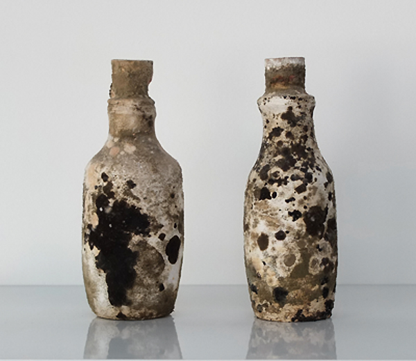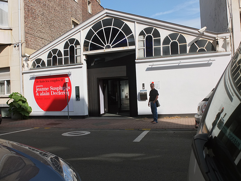 La pièce emblématique de notre entrée en matière si j’ose dire, est un autoportrait du couple en céramique, qui pose près de sa production, une drôle de patate verte deux fois plus grosse qu’eux, mise sur des tréteaux comme à la foire, et à leur pied une mappemonde dégonflée et un peu sale… ça disait la nécessité d’inscrire un travail dans le monde de l’art contemporain et dans le monde tout court.